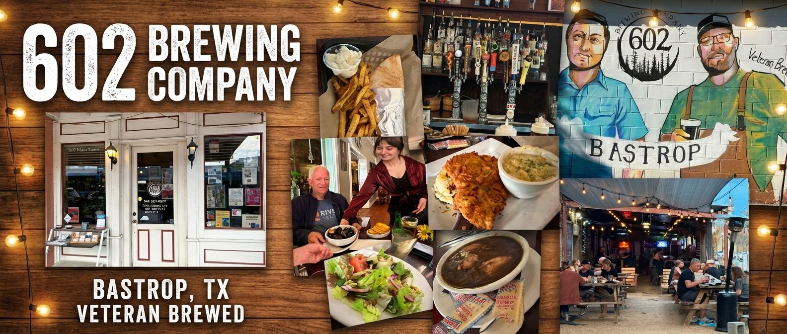 📍 919 Main Street, Bastrop 📞 (512) 321-3577 🕐 Tue-Wed 11 AM-9 PM | Thu 11 AM-11 PM | Fri-Sat 11 AM-midnight | Sun 3-9 PM | Mon closed 🔗 602brewing.com